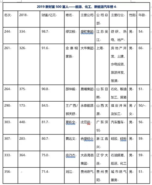 此外,上榜的大佬还有中国燃气邱达强、福佳集团王义政、山东岚桥集团叶成、亿利资源王文彪、奥德集团林凡连、美锦能源集团姚俊良、嘉晨集团孙寿宽、晨曦集团邵仲毅、永泰能源王广西/郭天舒、大连海昌集团曲乃杰、贵州燃气刘江、君正集团杜江涛、山东玉皇化工王金书家族、百川能源王东海家族、旭阳煤化工集团杨雪岗/路小梅、百川能源王东海、东华能源王铭祥/周一峰、杰瑞股份孙伟杰家族。