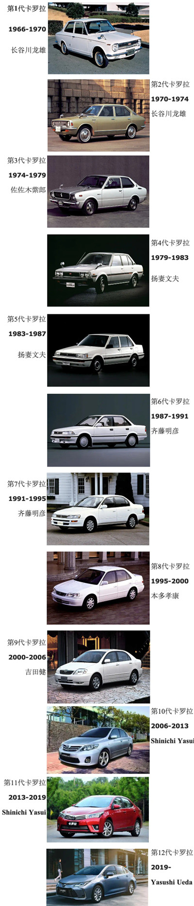 从丰田卡罗拉的发展历程中,历经多任主任工程师,在每一代主任工程师都有其自己的想法,展现出各自不同的理念。尤其是在设计层面,每一代都有巨大的变化,这些车型都打上了主任工程师本人独特的风格烙印。
