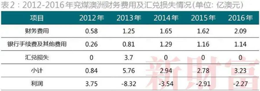 从上面的表看出来,尽管近几年煤价走低,但兖煤澳洲的生产成本基本还是低于销售价,还有一定的毛利。也就是说,兖煤澳洲陷入长期亏损除了生产经营不善之外,还另有他因,其中最主要的就是财务费用。