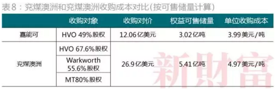 而收购的对手方嘉能可,最终也得到了不菲的回报:嘉能可花费12.06亿美元获得HVO 49%股权后,相当于得到 3.02亿吨煤炭可售权益储量。根据兖煤澳洲的竞标方案,兖煤澳洲在支付26.9亿美元后可获得C&A 可售权益储量为5.41亿吨,兖煤澳洲的单位储量收购成本要高于嘉能可,并且嘉能可收购的是C&A最核心、最优质的资产。