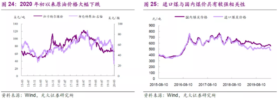 2016 年我国煤炭供给侧改革使煤炭行业景气度大幅回升,澳大利亚作为我国最大的煤炭进口国也在煤价上涨中受益。2018 年以来虽然在进口政策的调节下,国内煤价与进口煤价差变宽,但二者依然存在较强相关关系。从数据上来看,虽然2020 年初以来油价大幅下跌,但同期澳大利亚纽卡斯尔煤价相对平稳。