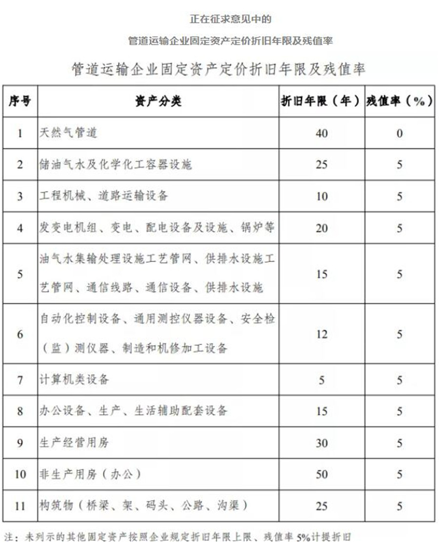 值得注意的是,正在征求意见的天然气管道运输定价成本监审办法延长了天然气管道的折旧年限,折旧年限从30年延长到40年,并完善细化了管道运输企业固定资产定价折旧的年限及残值率。如目前对房屋、建筑物的定价折旧年限为30年,新的征求意见版本则将房屋分为生产经营用房和非生产用房(办公),分别对应的折旧年限为30年、50年,残值率均为5%;此外还对通用设备和设施的类别也细分。