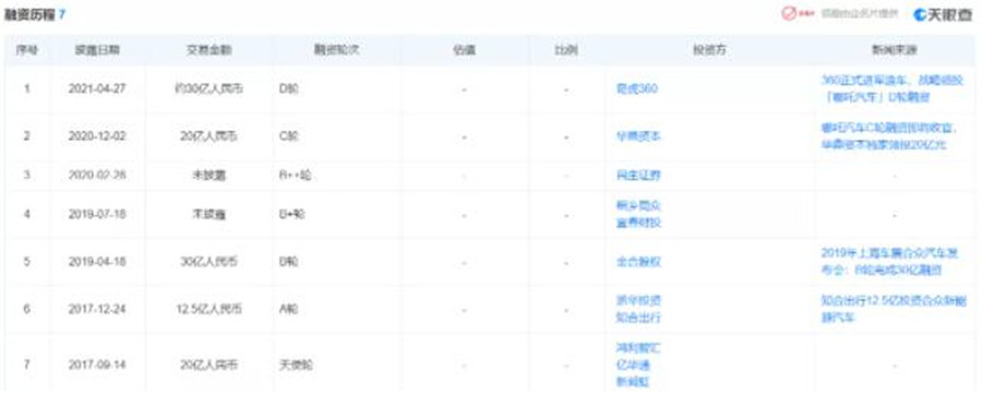 此前,哪吒汽车共经历了7轮融资。天眼查数据显示,在今年4月27日的最新D轮融资,奇虎360以30亿元人民币入股了哪吒汽车,成为其第二大股东。