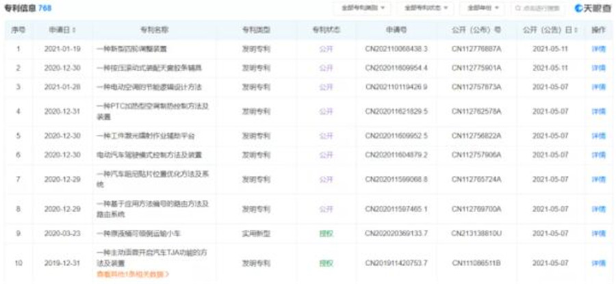 天眼查也显示,截至2021年5月13日,哪吒汽车手握768项技术专利,涵盖整车制造、动力电池包、电驱动、汽车安全、智能驾驶等。