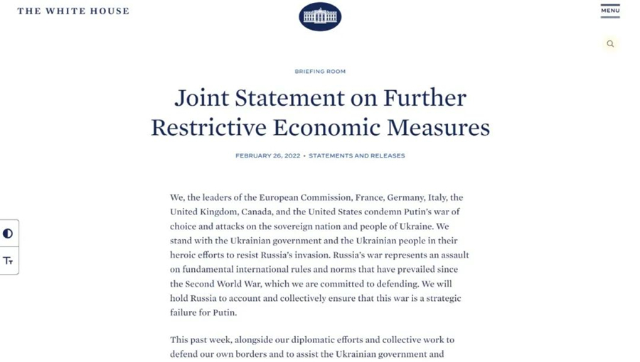 当地时间2022年2月24日,美国总统拜登在白宫就乌克兰局势发表讲话,表示他与七国集团的其他领导人同意推进“毁灭性”的一揽子制裁和其他经济措施,“这将给俄罗斯经济带来立刻以及长期的惨重代价”,以追究俄罗斯的责任,俄罗斯在美国的所有资产都将被冻结,美国将同盟友一道,限制俄罗斯使用美元、欧元、英镑和日元做生意的能力。本次制裁中,美国瞄准了合计1.4万亿美元规模的俄罗斯资产,涉及近80%的俄罗斯银行业资产。