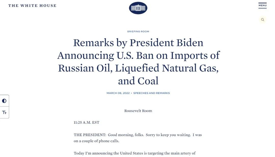 当地时间2022年3月8日,美国总统拜登正式签署行政命令,禁止美国从俄罗斯进口能源,包括禁止进口俄罗斯原油和某些石油产品、液化天然气和煤炭;禁止美国对俄罗斯能源部门的新投资;禁止美国人资助或支持在俄罗斯投资能源公司等。