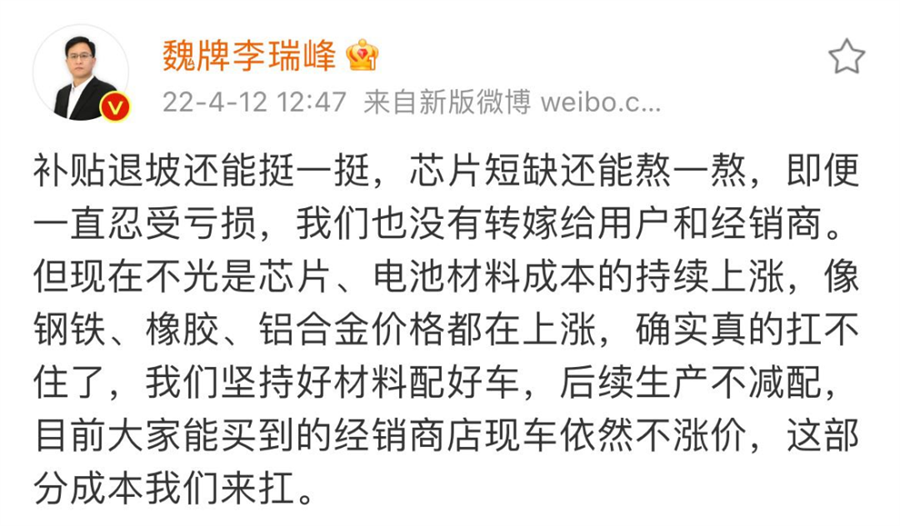 据魏牌汽车官网,此次涨价是受到了原材料、芯片及核心零部件价格大幅上涨等综合因素的影响。魏牌汽车CEO李瑞峰还在社交媒体上发文称:“现在不光是芯片、电池材料成本持续上涨,像钢铁、橡胶、铝合金价格都在上涨,确实真的扛不住了。”