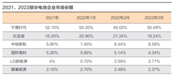 对比2021年和今年一季度中国动力电池市场装机数据发现,今年1-3月宁德时代装机份额均低于去年,相应的,比亚迪、中创新航则有着明显上涨。