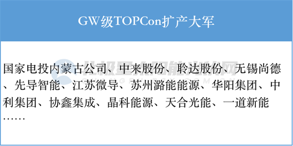 N型TOPCon电池的极限效率为28.7%,高于HJT,且可与现有的PERC产线兼容。领军扩产企业包括中来股份、一道新能、晶科能源、中利集团等。