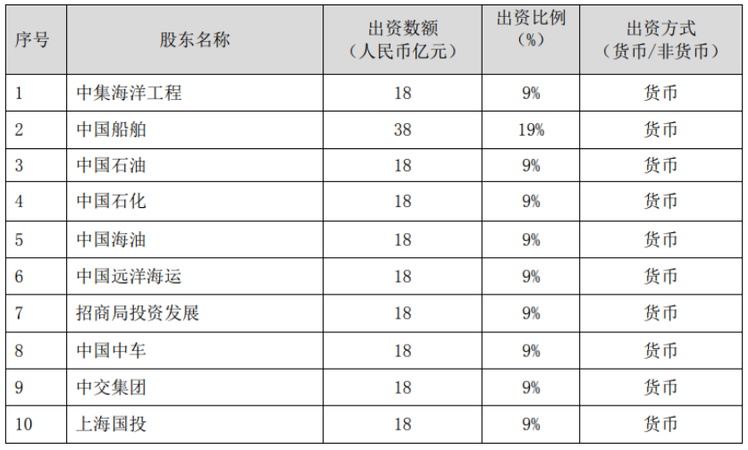 风芒能源梳理发现,除了引入烟台国资外,去年底,中集集团还披露称,全资控股子公司中集海洋工程有限公司与中国船舶、中石油、中石化、中海油、中国远洋海运集团有限公司、招商局投资发展有限公司、中车集团、中交集团及上海国有资本投资有限公司(上海国资委全资控股),共十家企业拟共同出资组建中国海洋工程装备技术发展有限公司(简称:中国海工技术),注册资本为人民币200亿元。