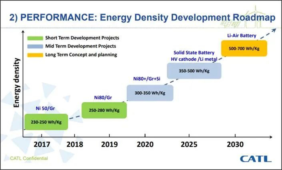 能量密度也直接关系到电池性能,能量密度越高,续航里程越长。比如下图是宁德时代发布的一个电池能量密度发展图,可以看到近些年的发展速度很快。
