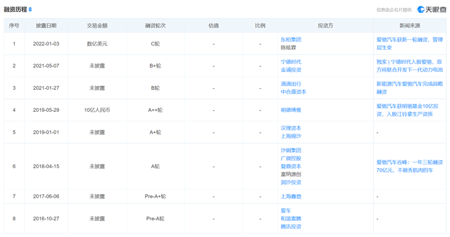 根据天眼查数据显示,截至今年1月爱驰汽车已进行了7轮融资,融资方包括宁德时代、沙钢集团、滴滴出行,中合盛资本、陈炫霖及其旗下东柏集团等。据公开披露的资金额度,爱驰汽车融资总额已经超过百亿元。