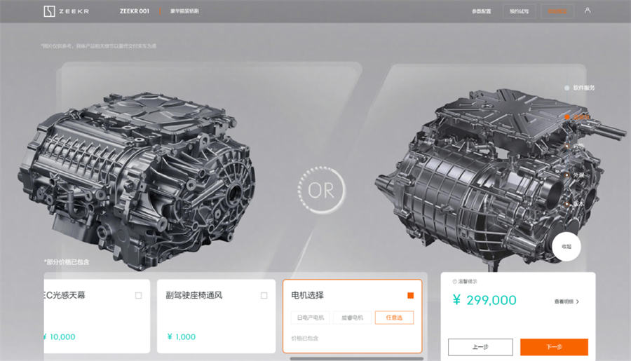 众所周知,电池、电机、电控是电动汽车最核心的部件,直接影响产品的性能表现,同时也是用户在购车时最关心的部分。在极氪这里,电机在购车流程中是有两种选择的,一种是日电产电机,另一种是威睿电机,用户在下定时可以任选一个。
