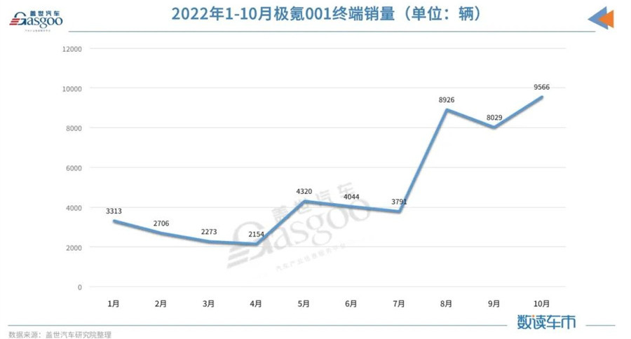 回顾过去10个月,极氪在历经一系列风波之后,今年终迎来了曙光。终端销量数据显示,极氪前10个月累计销量为49122辆,尤其自7月以来,极氪唯一在售车型极氪001销量逐月走高,10月终端销量达到了9566辆,走势出乎意料。