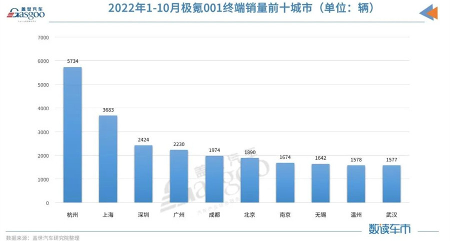 极氪001前10个月终端销量前十的城市依次是杭州、上海、深圳、广州、成都、北京、南京、无锡、温州、武汉,这10个城市终端销量占极氪001全国总体销量的49.68%,几乎占了一半。