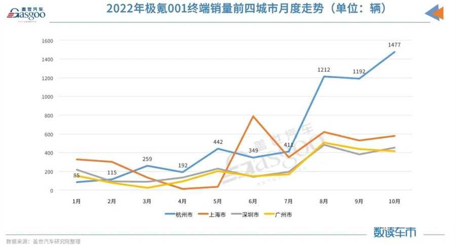 值得注意的是,如果从每个城市单看极氪001的终端销量,除了杭州,其在剩余城市的月销均不过千,比如排在城市销量第二的上海,极氪001十月份的销量只有580辆,排在第三的深圳,极氪001十月份的销量是454辆。要知道,北、上、广、深一直都是高端新能源车销量的主要承载城市,但是显然极氪001当前在这些城市销量占比还比较低。