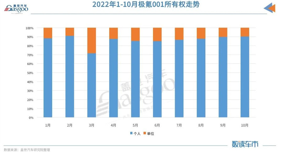 从终端销量来看,一向宣称自己为用户型企业的极氪,其用户也大多为个人用户。数据显示,极氪001今年前10个月的个人用户销量有42968辆,占比约87.5%;单位用户销量为6153辆,占比约12.5%。
