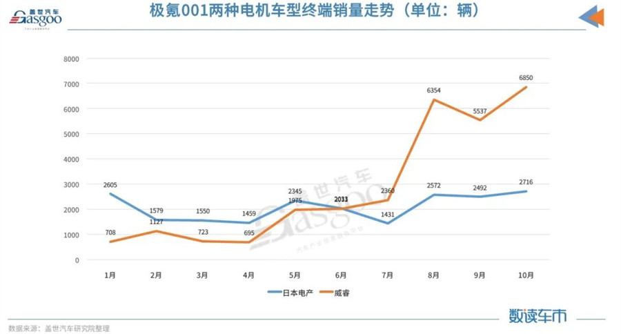 从终端销量来看,1-10月搭载日电产电机的极氪001销量为20782辆,占比42.31%;搭载威睿电机的极氪001销量为28340辆,占比57.69%。另外从月度销量走势来看,搭载威睿电机的终端销量自4月起逐月提升,而搭载日电产的终端销量却一直处在2000辆上下。
