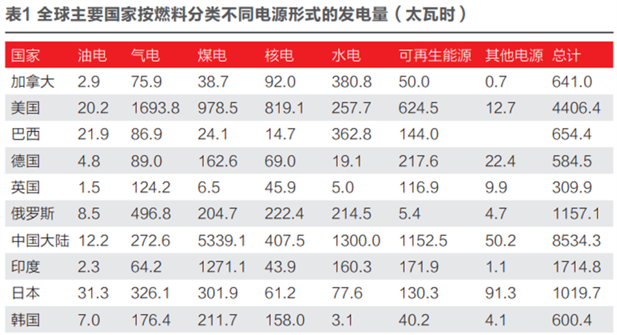 按照电源形式分类,全球重油发电为720.3太瓦时,天然气发电为6518.5太瓦时,燃煤发电为10244.0太瓦时,核电为2800.3太瓦时,水电为4273.8太瓦时,可再生能源发电为3657.2太瓦时,其他电源形式为252.2太瓦时。在全球电力系统中,煤炭、天然气、重油等化石燃料的发电量占比最大,为61.42%。化石燃料中石油主要以交通运输使用为主。