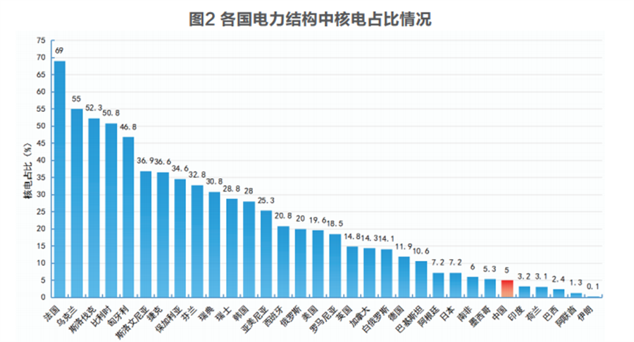 我国核电发电量为407.5太瓦时,位居世界第二,仅次于美国,但是在我国电力结构中的占比仅为5%,在全球32个有核电的国家中,我国核电占比仅排在第27位。
