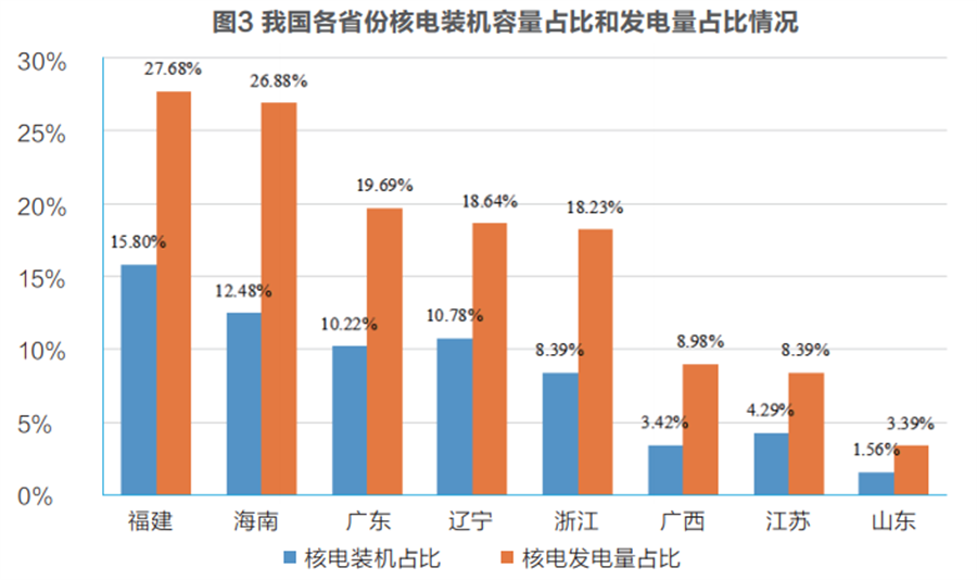 从具有核电的省份来看,核电在当地电力结构中的占比已经达到发达国家水平,如福建、海南的核电发电量在其电力结构中占比将达到1/3,广东、辽宁、浙江等三省的核电发电量也将近20%。