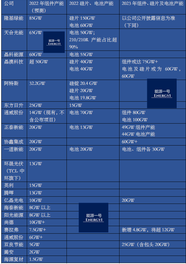 从产能方向看,2022年主要光伏厂商的组件产能已超500GW,今年(2023)必然将是延续龙争虎斗的时点。