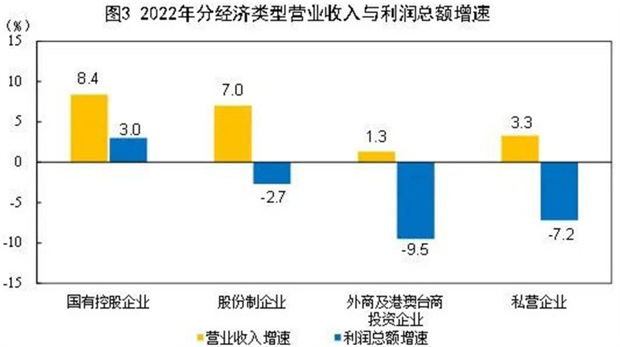 2022年,规模以上工业企业中,国有控股企业实现利润总额23792.3亿元,比上年增长3.0%;股份制企业实现利润总额61610.9亿元,下降2.7%;外商及港澳台商投资企业实现利润总额20039.6亿元,下降9.5%;私营企业实现利润总额26638.4亿元,下降7.2%。