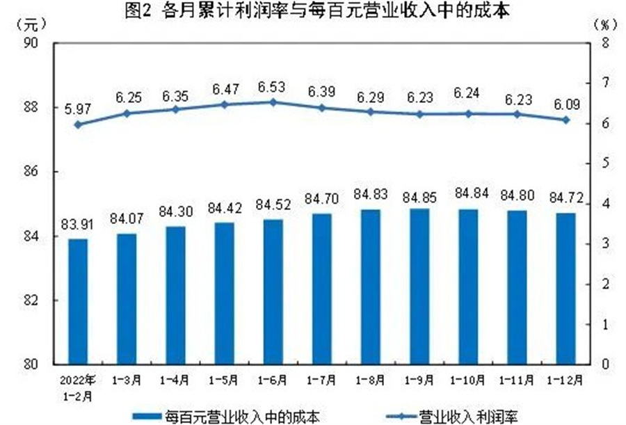 2022年,规模以上工业企业每百元营业收入中的成本为84.72元,比上年增加0.91元;每百元营业收入中的费用为8.20元,比上年减少0.42元。