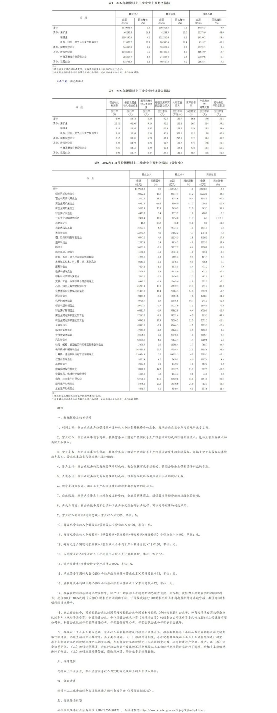 2022年,规模以上工业企业实现营业收入137.91万亿元,比上年增长5.9%;发生营业成本116.84万亿元,增长7.1%;营业收入利润率为6.09%,比上年下降0.64个百分点。