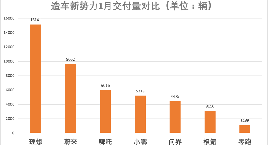 2月1日,造车新势力悉数公布了今年1月份的交付数据。理想汽车以1.51万辆拿下新年第一个月度销冠,交付量垫底的零跑汽车则仅交付1139辆。