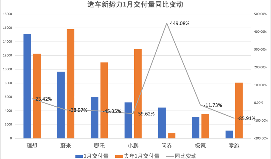 对于今年1月份车市表现不佳,市场早有预期,不过几家销量低的交付数据还是令不少业内人士大跌眼镜。在被统计的几家新势力中,仅有理想和AITO问界实现了同比的交付量增长,但问界的同比增长其实只是建立在其交付初期的低基数基础之上。零跑汽车1月交付量较去年同期下滑最为严重,降幅达到了85.91%。