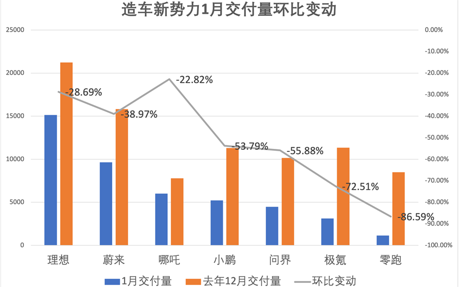 曾多次成为新势力交付第一的哪吒汽车近几个月来难掩颓势,1月交付量为6016辆,同比下跌45.35%。