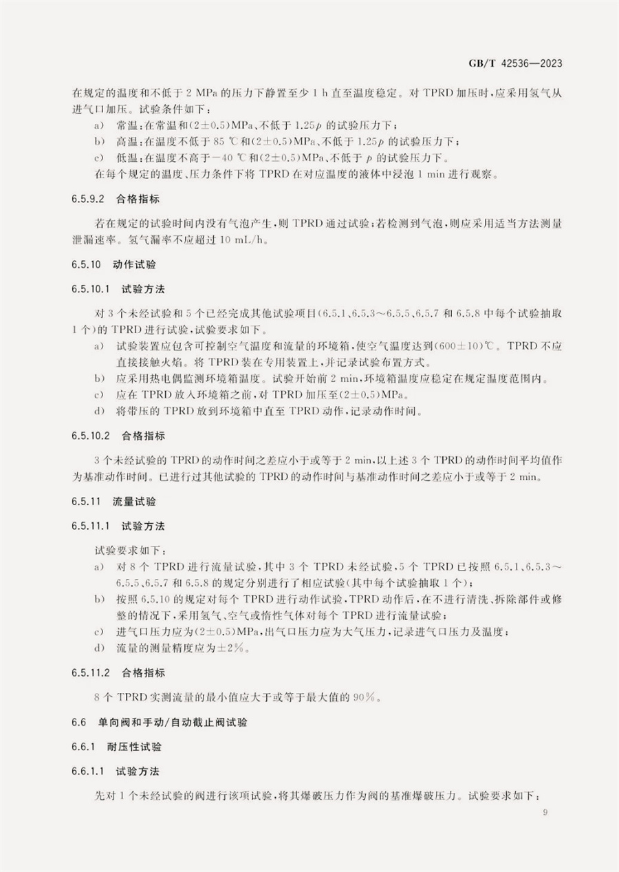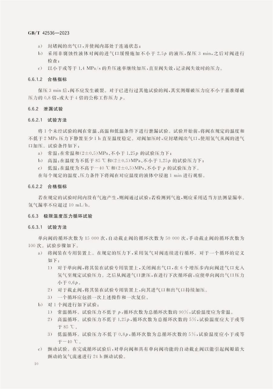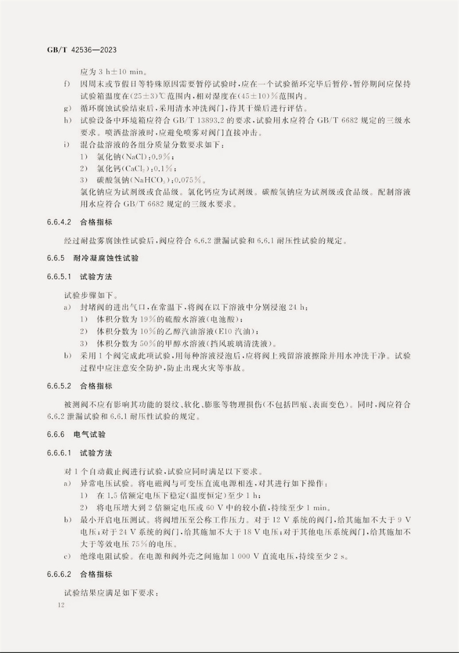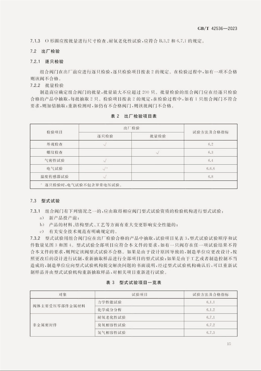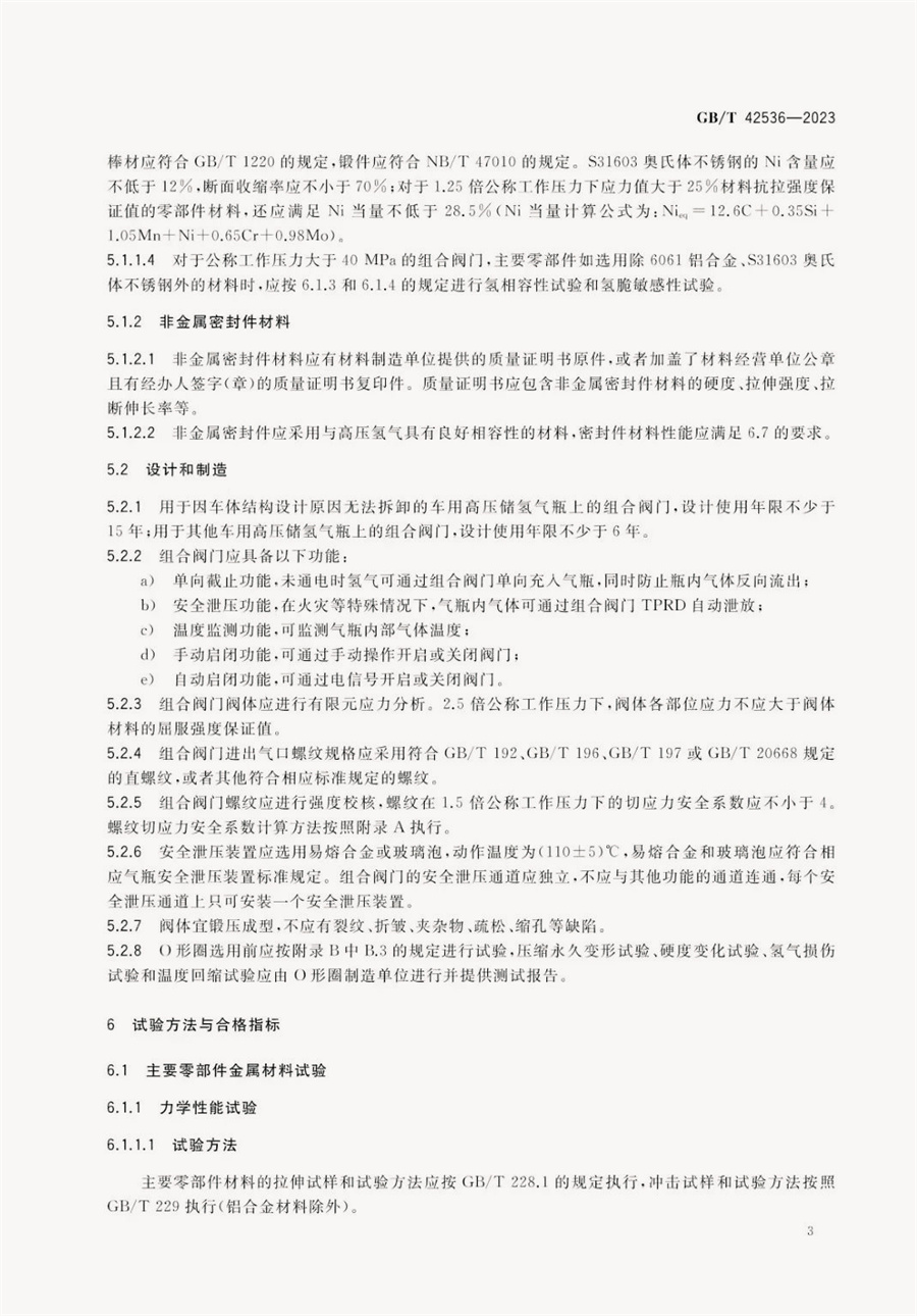该标准规定了车用高压储氢气瓶组合阀门(以下简称组合阀门)的基本型式、技术要求、试验方法与合格指标、检验规则、标志、包装、运输、贮存等要求。该标准适用于公称工作压力不大于70MPa、工作温度为-40C~85C、固定在道路车辆上用作燃料箱的车用高压储氢气瓶用组合阀门。车用高压储氢气瓶用温度驱动安全泄压装置的型式试验可参照本文件进行。