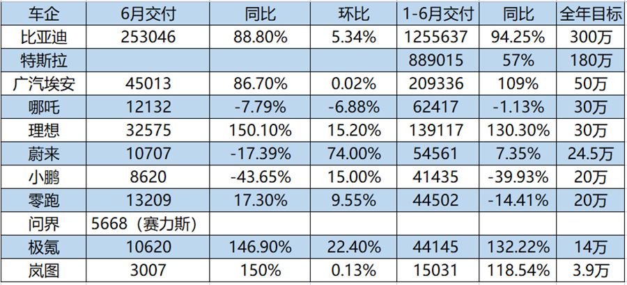 此外,新浪科技还注意到,结合1月到6月全部数据,目前国内新能源车企均未达到全年目标的50%。