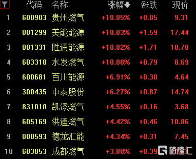今日看A股燃气概念股亦拉升走强。个股中,贵州燃气、美能能源、胜通能源、水发燃气4股拉升涨停,百川能源、中泰燃气涨超6%,成都燃气等跟涨。