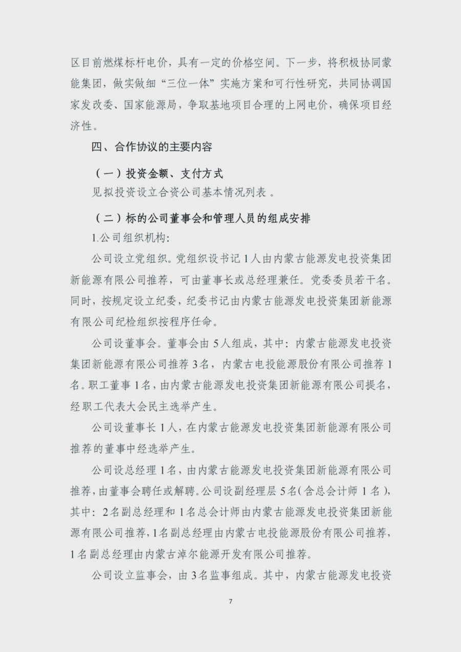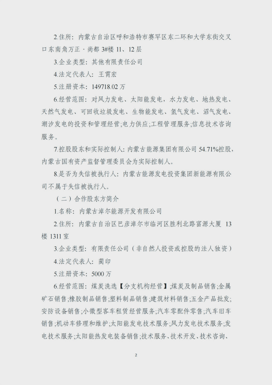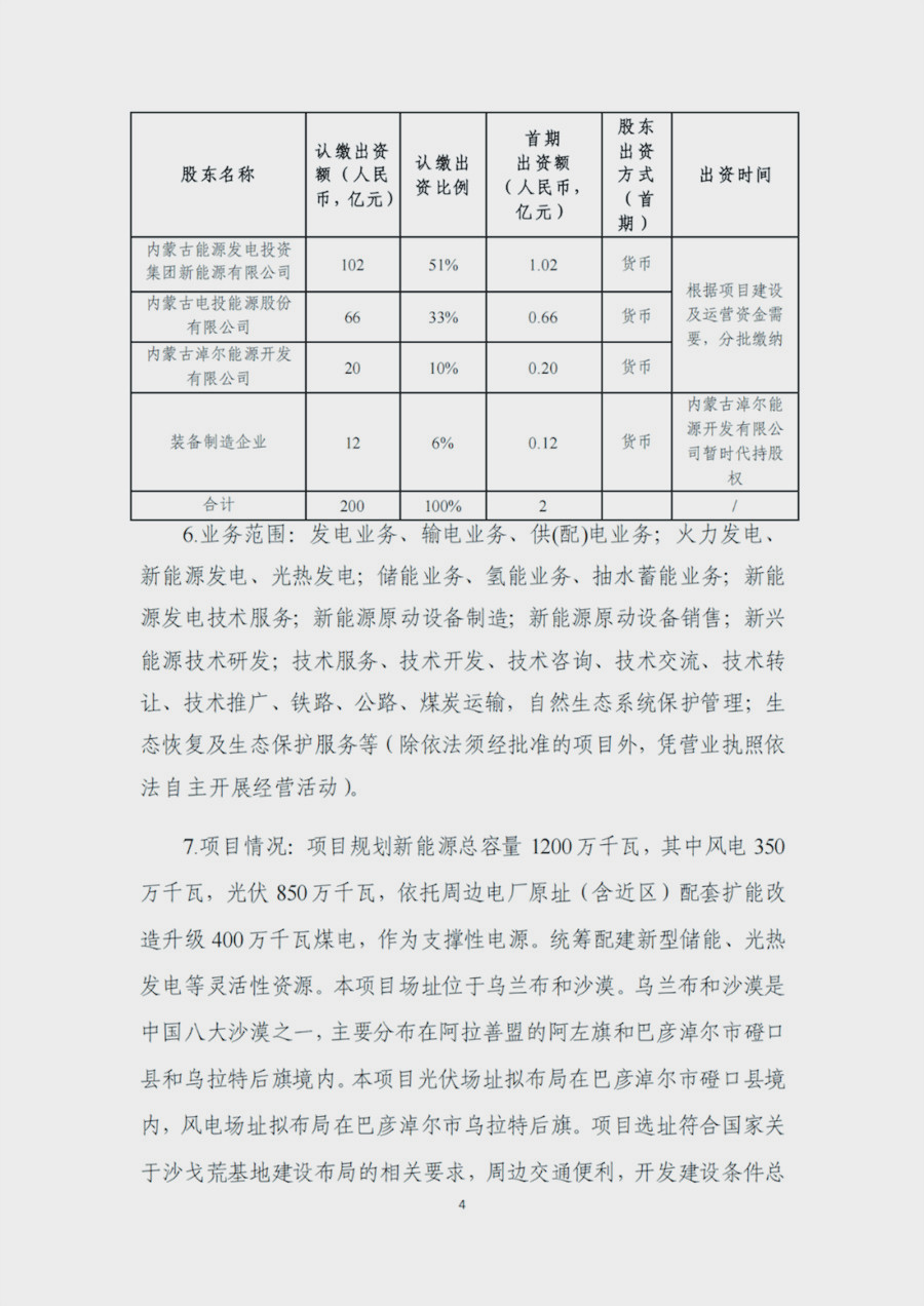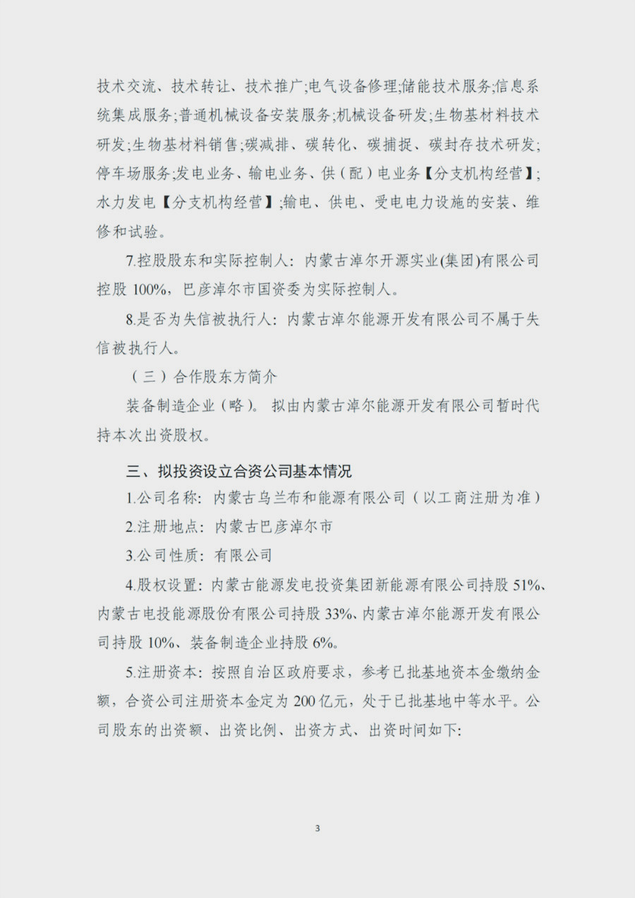 公告显示,上述拟设立的合资公司名称为内蒙古乌兰布和能源有限公司(以工商注册为准),内蒙古能源发电投资集团新能源有限公司持股51%、内蒙古电投能源股份有限公司持股33%、内蒙古淖尔能源开发有限公司持股10%、装备制造企业持股6%。按照自治区政府要求,参考已批基地资本金缴纳金额,合资公司注册资本金定为200亿元,处于已批基地中等水平。