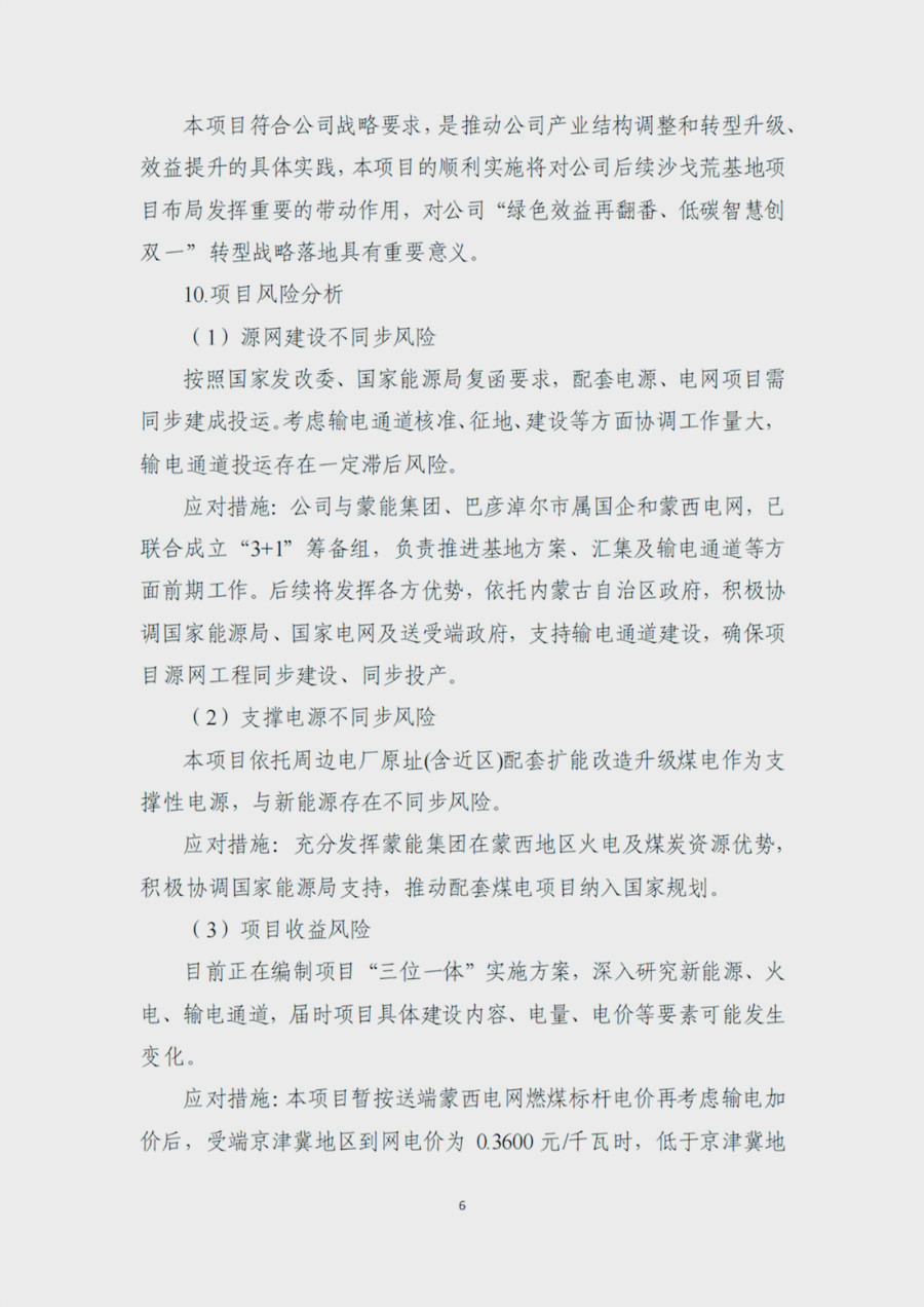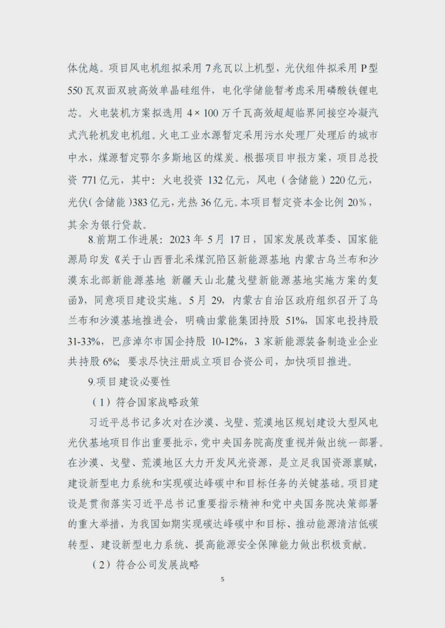 前期工作进展如下:2023年5月17日,国家发展改革委、国家能源局印发《关于山西晋北采煤沉陷区新能源基地内蒙古乌兰布和沙漠东北部新能源基地新疆天山北麓戈壁新能源基地实施方案的复函》,同意项目建设实施。5月29日,内蒙古自治区政府组织召开了乌兰布和沙漠基地推进会,明确由蒙能集团持股51%,国家电投持股31-33%,巴彦淖尔市国企持股10-12%,3家新能源装备制造业企业共持股6%;要求尽快注册成立项目合资公司,加快项目推进。
