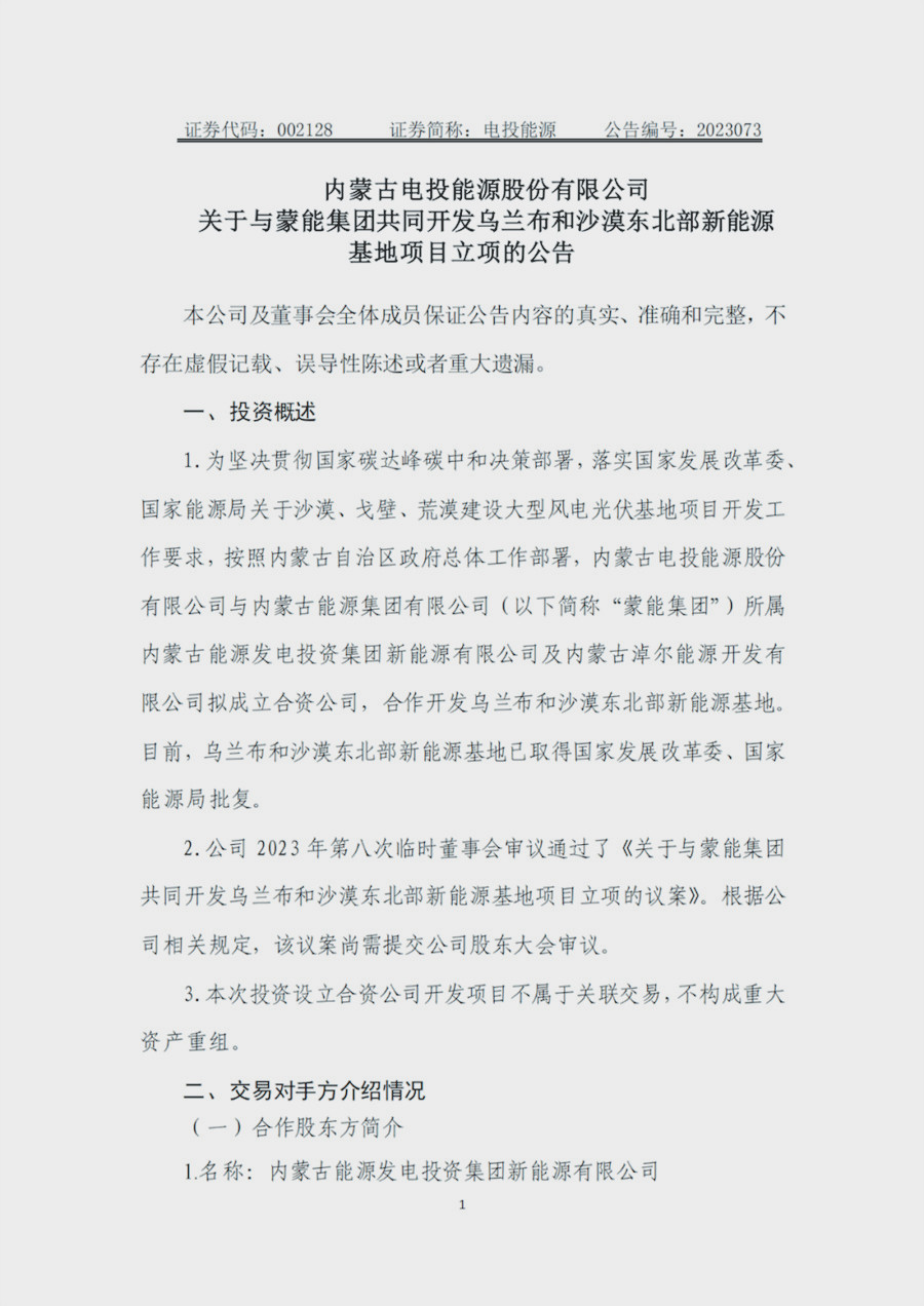 10月10日,内蒙古电投能源股份有限公司(A股简称:电投能源,深交所主板A股代码:002128)对外发布《关于与蒙能集团共同开发乌兰布和沙漠东北部新能源基地项目立项的公告》(以下简称公告)称,电投能源与内蒙古能源集团有限公司(以下简称“蒙能集团”)所属内蒙古能源发电投资集团新能源有限公司及内蒙古淖尔能源开发有限公司拟成立合资公司,合作开发乌兰布和沙漠东北部新能源基地。目前,乌兰布和沙漠东北部新能源基地已取得国家发展改革委、国家能源局批复。