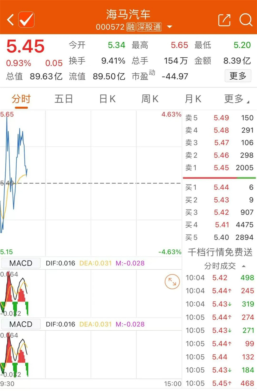 11月14日,海马汽车低开1.11%,截至发稿,股价报5.45元,涨0.93%。