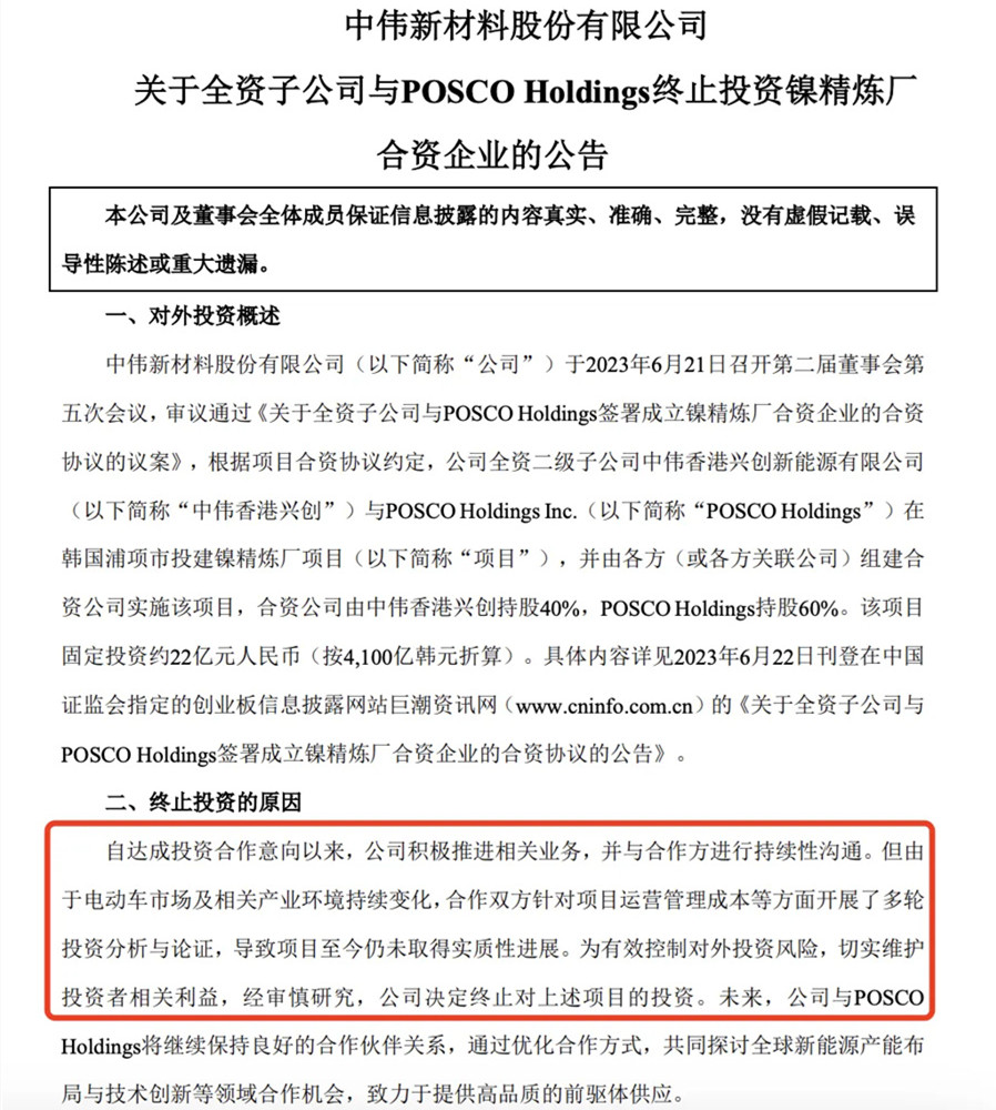 中伟股份称,由于电动车市场及相关产业环境持续变化,合作双方针对项目运营管理成本等方面开展了多轮投资分析与论证,导致项目至今仍未取得实质性进展。公司决定终止对该项目的投资。