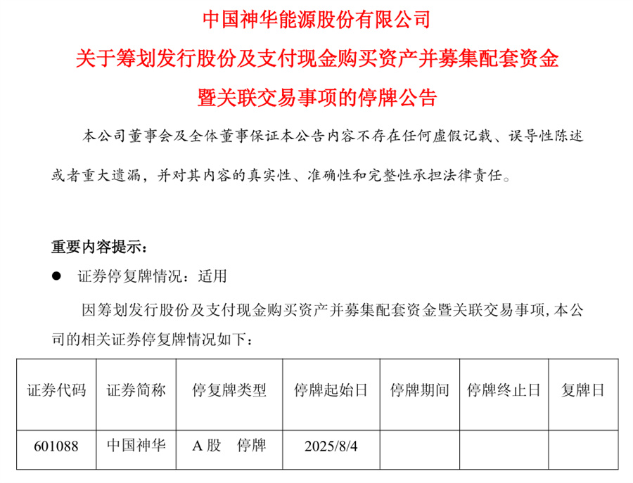 近日,中国神华发布公告,收到控股股东国家能源投资集团有限责任公司(以下简称“国家能源集团”)的《关于筹划重大事项的通知》,初步考虑拟由公司发行股份及支付现金购买国家能源集团持有的煤炭、坑口煤电以及煤制油煤制气煤化工等相关资产并募集配套资金。公司股票自8月4日开市起停牌,预计停牌时间不超过10个交易日。