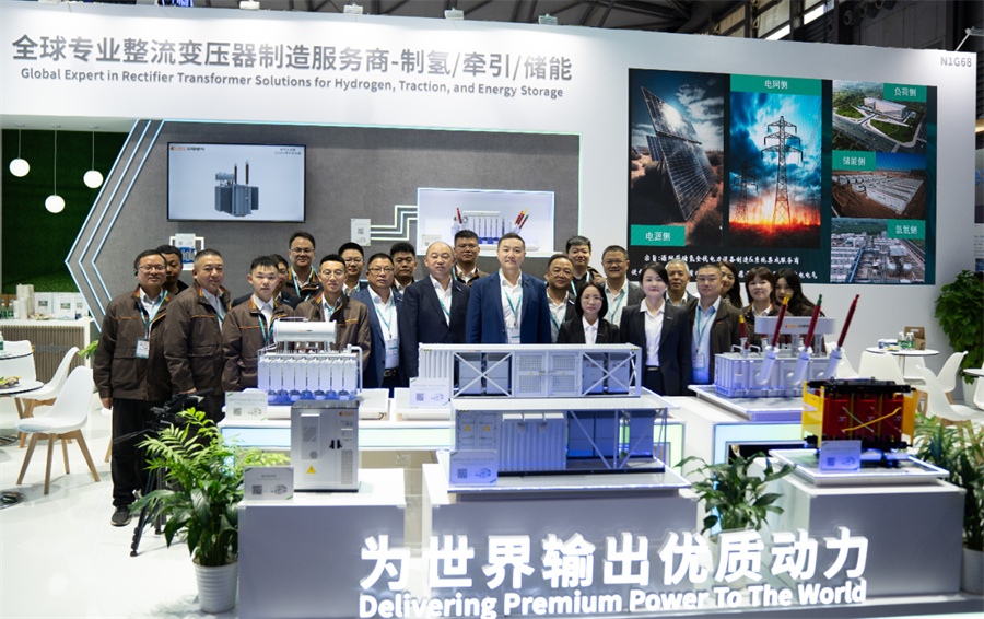 此次EP电力展,中电电气重点推出了三大类核心产品:制氢电源系统,为绿氢制备提供高效、稳定的电力支撑;牵引变压器,广泛应用于轨道交通、电气化铁路等场景;储能一体机与预制舱,具备高能量密度与智能运维能力,服务于电网调峰与新能源消纳。