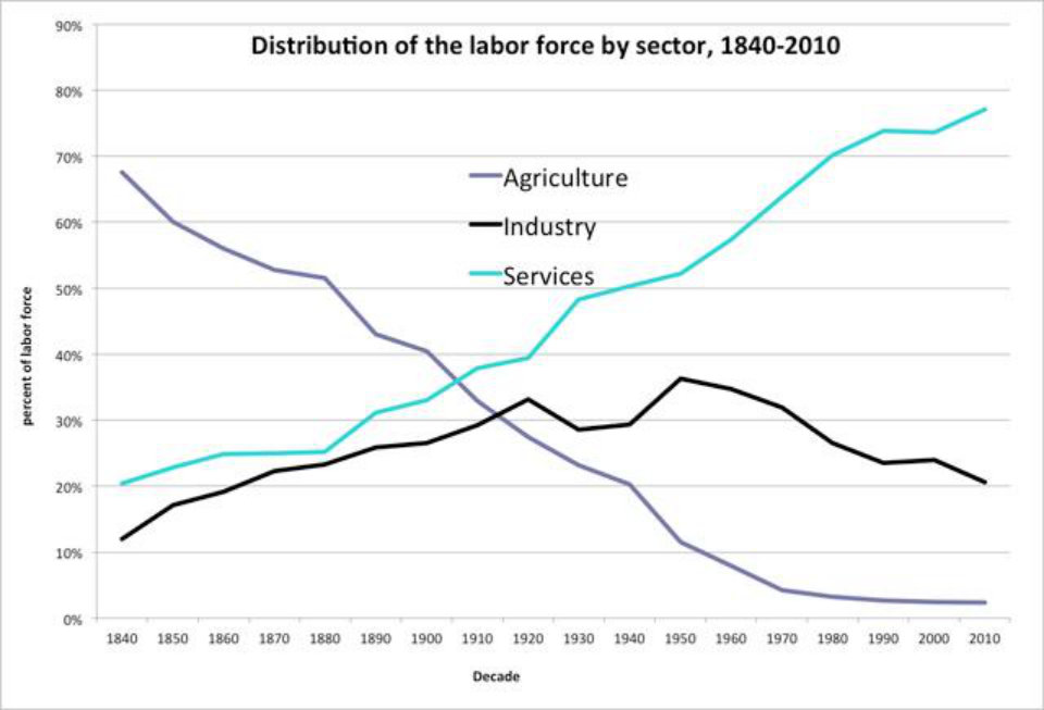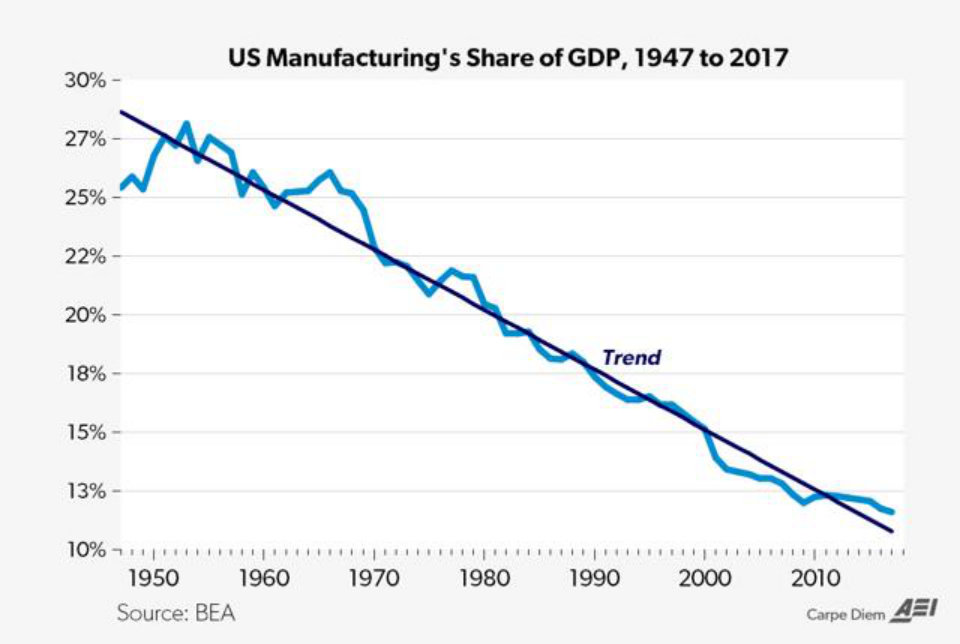 当然了,企业还有一种选择,那就是放弃这个"钱少事多"的制造业领域,改行进入其他行业,这在近几十年的美国似乎已经成为一种趋势。随着代表着"实体经济"的制造业地位的下降,美国经济在"服务化"的道路上越走越远。