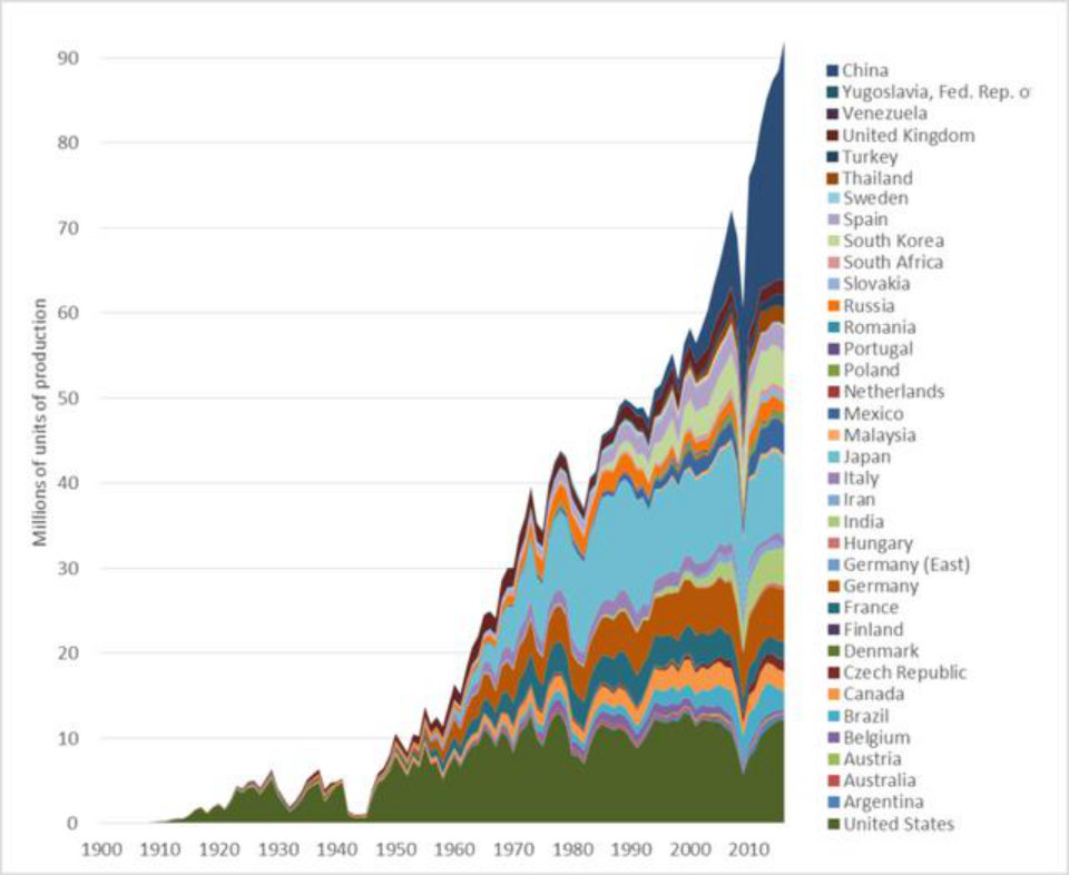此后爆发的一战带来了庞大的海外需求,这给美国制造业插上了翅膀,让它达到了更高的巅峰。在一战正酣的1915年,仅美国福特公司一年制造的汽车就是德、英、法等国总和的14倍;到1920年代后期,光纽约市的汽车数量就超过了欧洲所有国家的总和;即使在1929-1933年大萧条时期,美国的制造业产值仍超过了英、法、德的总和,维持在全球总量1/3的水平。
