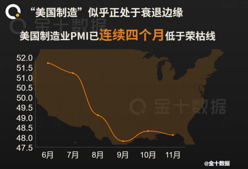 据媒体近日报道,美国供应管理学会最新公布的数据显示,11月份美国制造业采购经理人指数(PMI)环比下降0.2至48.1,连续四个月萎缩。一般来说,制造业PMI以50为荣枯线,高于50意味着制造业活动扩张,而低于50意味着制造业活动收缩。美国11月制造业PMI再度低于荣枯线,并且是连续4个月萎缩,足以说明美国制造业的现状不容乐观。