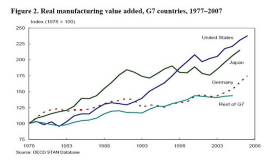 美国2009年发布的制造业白皮书显示,美国制造业的小时生产率(衡量制造业产能销量的关键指标)一直以线性趋势稳步提升,即使是被认为制造业衰败最严重的2000年以后也是如此。而按照美国劳工部的数据,1987年到2010年美国制造业的劳动生产率增长了114.8%。制造业产值仍然增加了45.6%。而且,与G7国家中的其他制造业大国相比,美国制造业的产值增速也超过了传统制造业强国日本和德国。