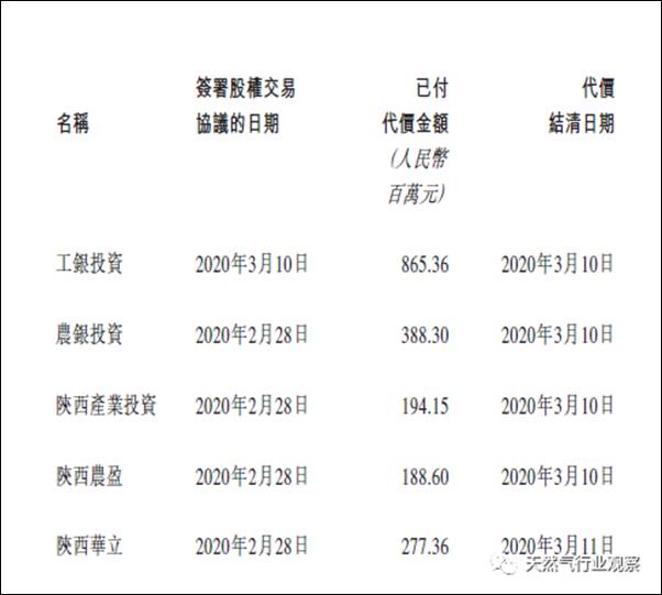 由工银投资、农银投资、陕西产业投资、陕西农盈以及陕西华立,分别受让获得延长天然气15.60%、7%、3.5%、3.4%和0.5%的股份。