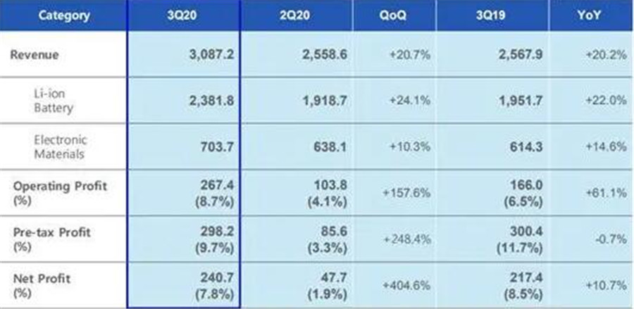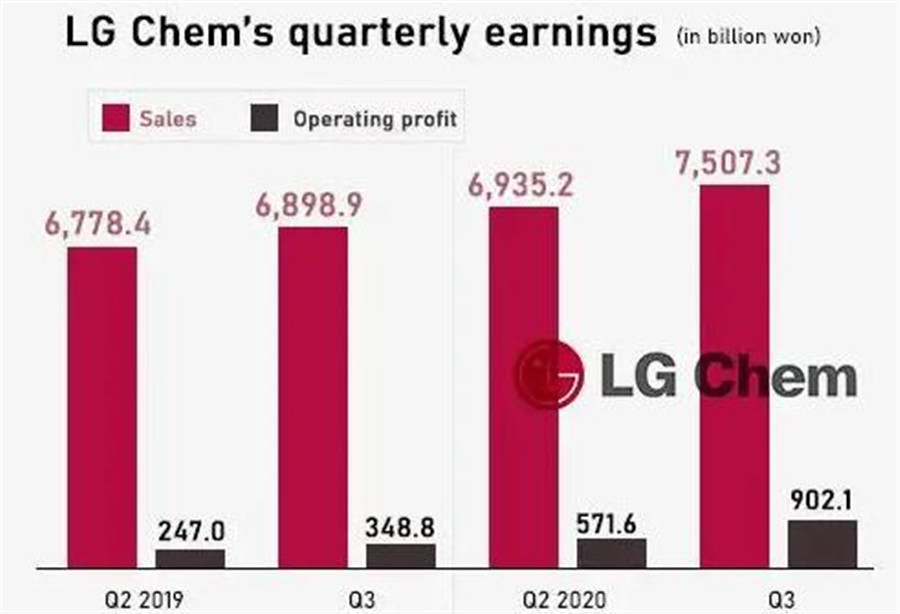 10月12日,LG化学公布了初步估算的第三季度经营业绩。得益于电动汽车电池和ABS、PVC等石化材料销售情况良好,第三季度销售额和营业利润均为史上最好的季度业绩,超出了市场预期。销售额达7.575万亿韩元,同比增长8.8%;营业利润达0.92万亿韩元,同比剧增158.7%。
