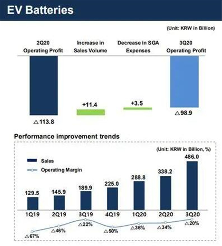 在电池业务方面,欧洲主要整车厂商推出新款电动汽车、新款IT产品需求扩大,推动动力电池和小型电池的供应量增加,营业利润和销售额分别达1688亿韩元和3.1439万亿韩元。