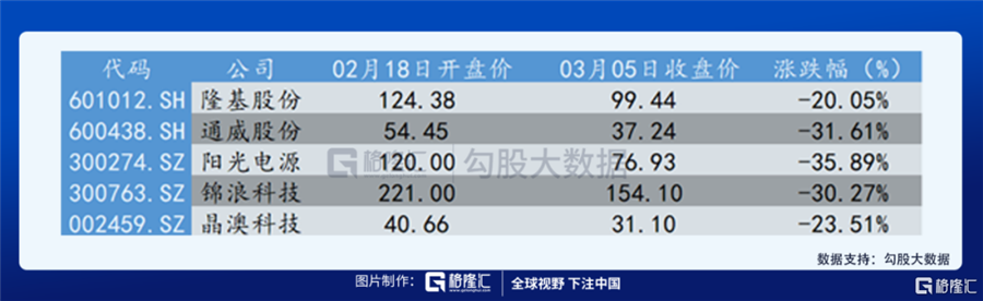 光伏板块也不例外,以光伏抱团股为例,从年后开盘,截止3月5日收盘,整体跌幅在20%-30%之间,也是一片惨象。